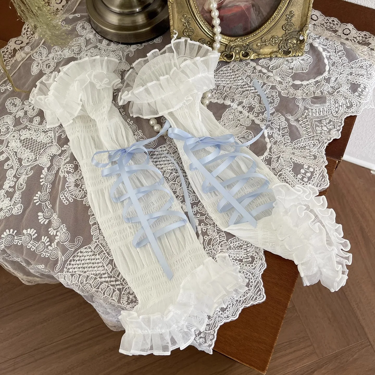 Japanese Y2K Harajuku Ballet Bow Tie Gloves Subculture Mesh Pleated Lace Sleeves Lolita Sweet JK Maid Long Cuff Gloves