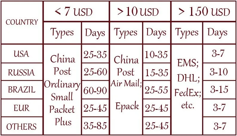 Order Value<$7 24 Countries Free Shipping Via China Post Ordinary Small Packet Plus.