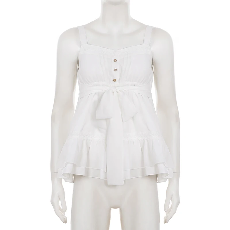 SUCHCUTE Sweet Lace Patchwork Bandage Ruffles Trim A-Tops Women’s Solid Sheer Button Front Squre Neck Camisole All Match Vest