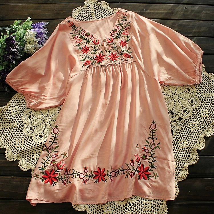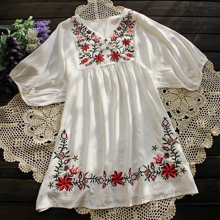 Women Mexican Embroidered Floral Peasant Blouse Vintage Ethnic Tunic Boho Hippie Clothes