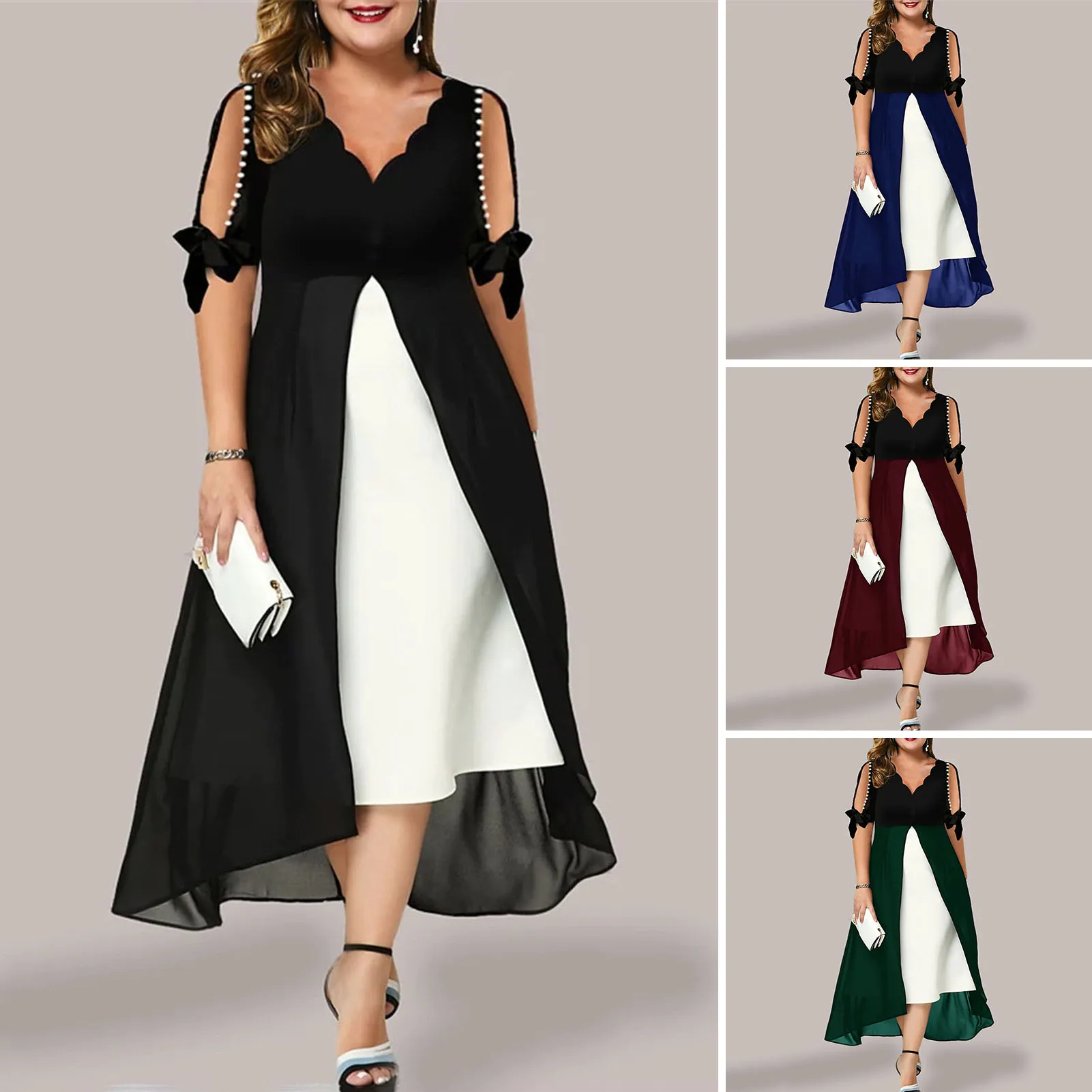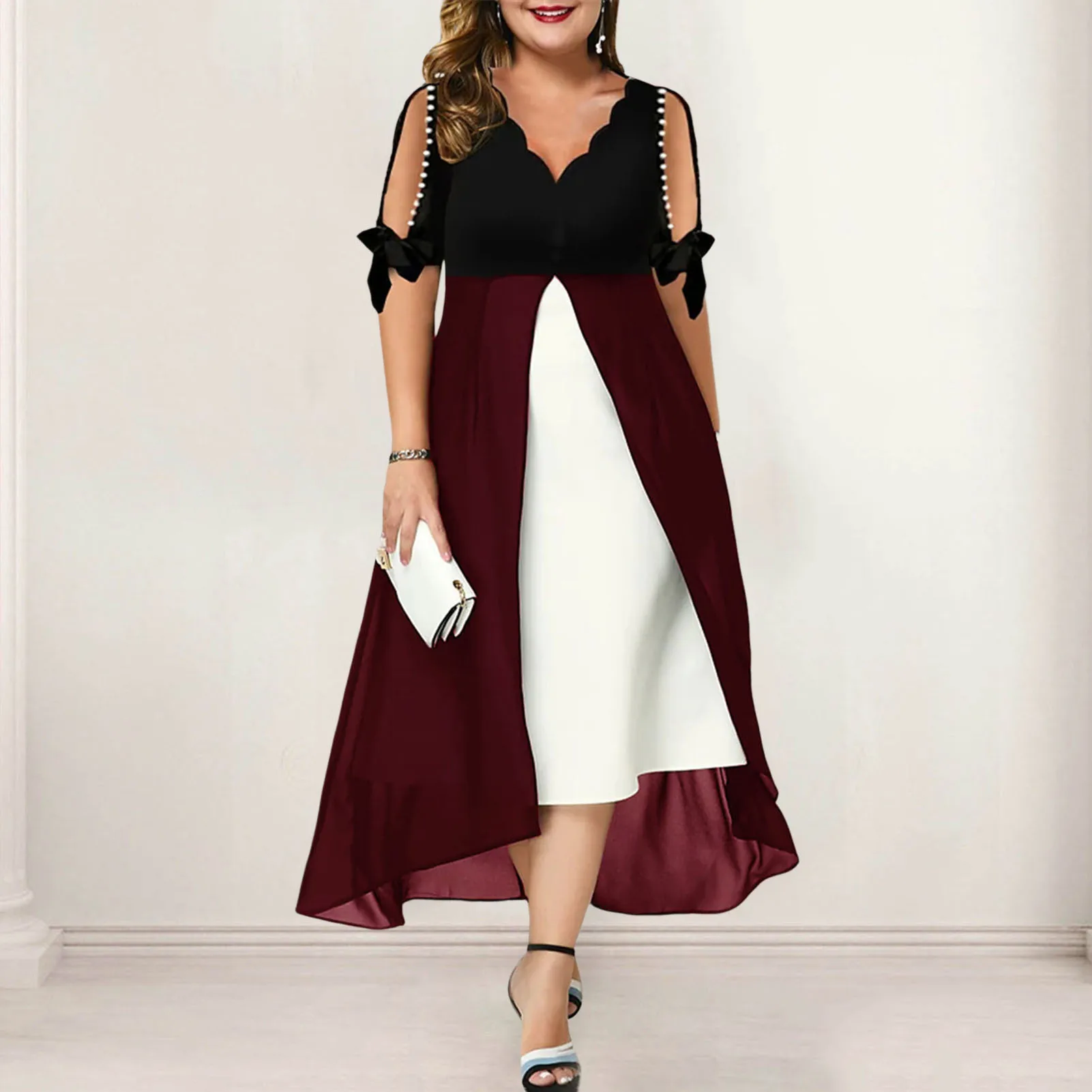 Features: Faux Pearls Decor, Cold Shoulder, Fake Two Pieces