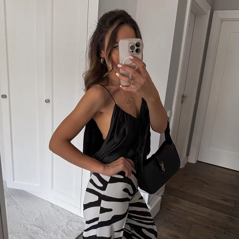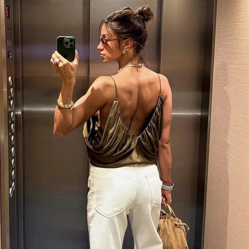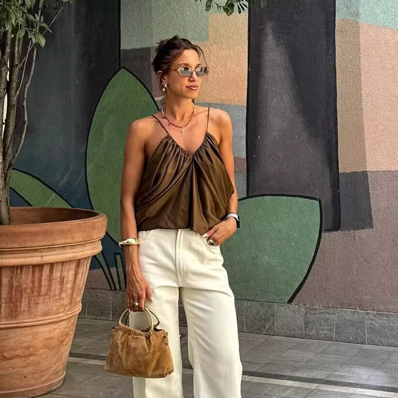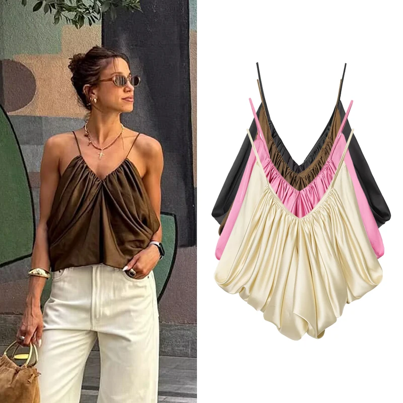 Women's Slip Tops Fashion Satin Pleated V-Neck Sleeveless Top Summer Sexy Female Chic Tops photo review